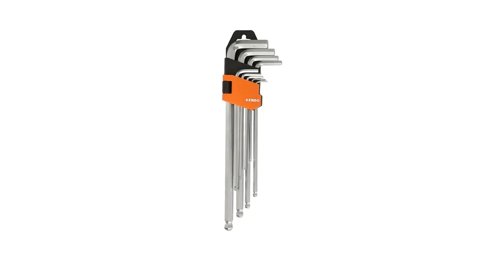 • Króm-vanádium acélból készült, 9 részes KENDO extra hosszú gömbvégű imbuszkulcs készlet• A gömbvég geometriája 0-25°-os szögben történő rögzítést tesz lehetővé• Edzett szárak a maximális erő és tartósság érdekében• A kompakt tartó elősegíti a kulcsok könnyű eltávolítását• Méret jelölés a tárolón• Növeli a kéz mozgásterét, ezért könnyű vele dolgozni nehezen hozzáférhető helyeken is