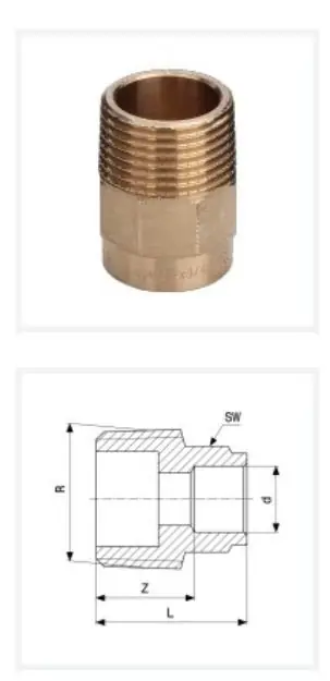Viega 4243G 5/4˝ * 35mm KM csatlakozó, vörösöntvényÁtmeneti idomforrasztható csatlakozó, R-menetKialakítás/felszereltségsokszögletű elemKülső csőátmérő d 35Kúpos külső menet R 1¼Befoglaló méretek Z 21 mmHossz L 44 mmKulcsnyílás SW 42 mmTömeg 139,14 gTérfogat 155,4 cm³Anyag vörösöntvény