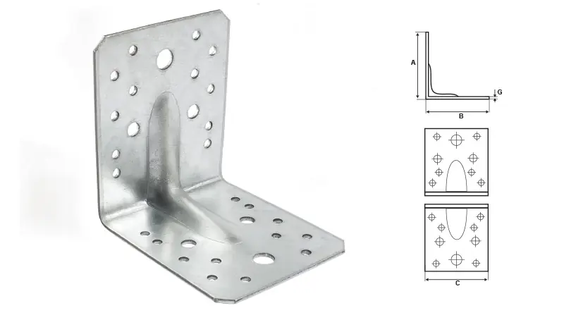Stalco erősített sarokösszekötő szeglemez, 105x105x90mm Erősített sarokösszekötő lemezhorganyzott, alacsony széntartalmú acéllemezfaszerkezetekhezméret: 105 x 105 x 90 mmvastagság: 2,5 mm