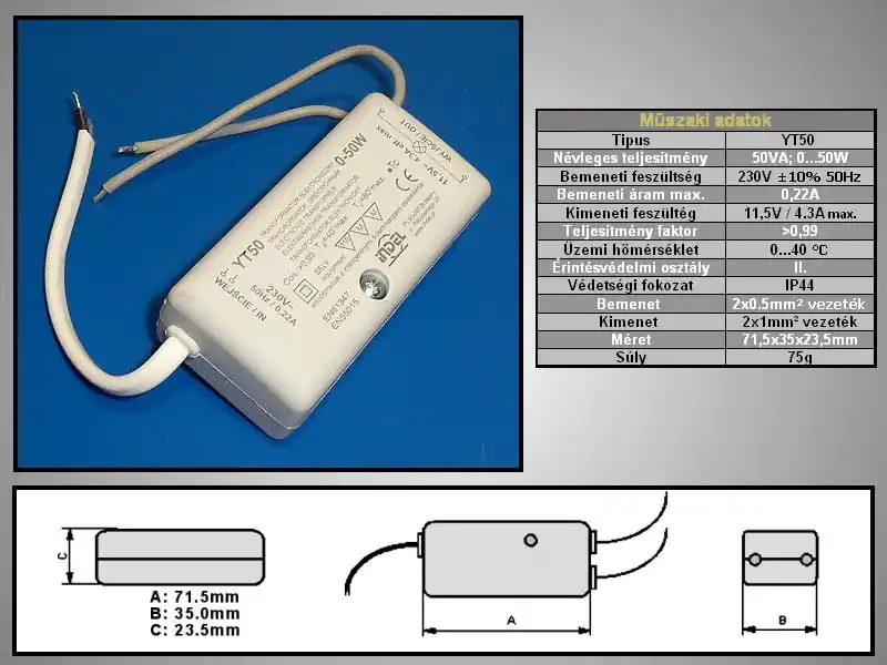 Tápegység halogén lámpához 230Vac / 11,5Vac4,3A 50W