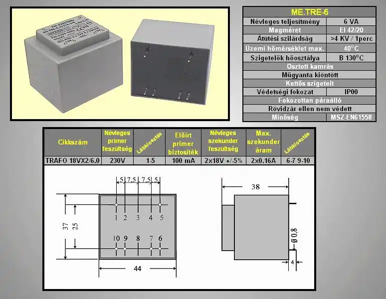 TRAFO 230VAC / 2×18.0VAC 6.0VA TRAFO18VX2/6.0 Gyors szállítás