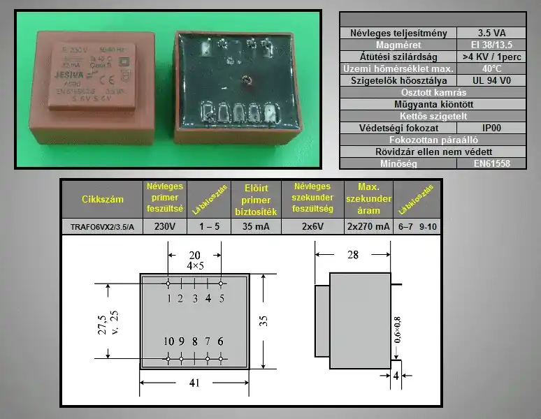 TRAFO 230VAC / 2x6VAC 2x0.27A 3.5VA TRAFO6VX2/3.5/A Csak ma mennyiség