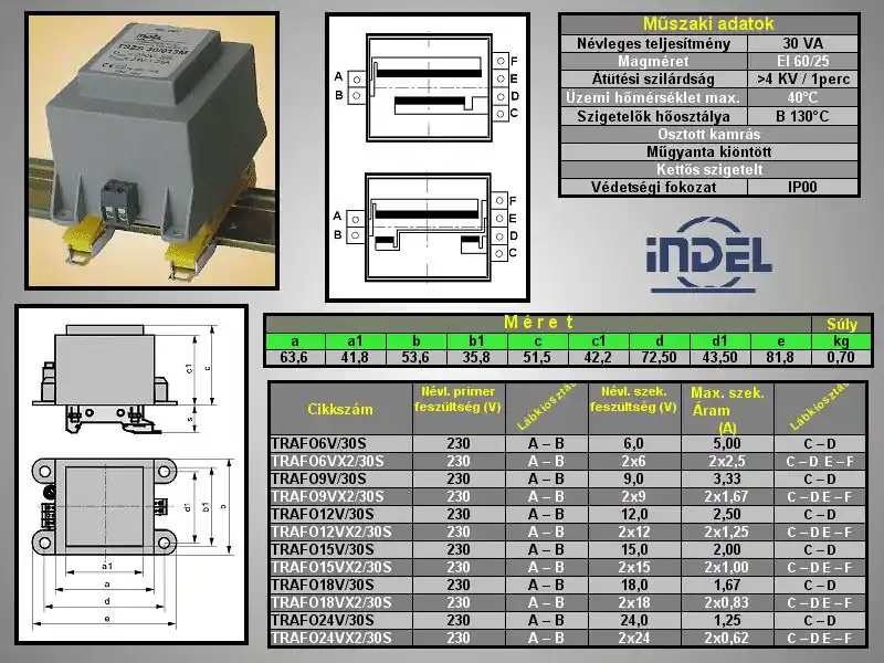 TRAFO 230VAC / 2x9VAC 2×1.67A 30VA TRAFO9VX2/30S Alacsony ár