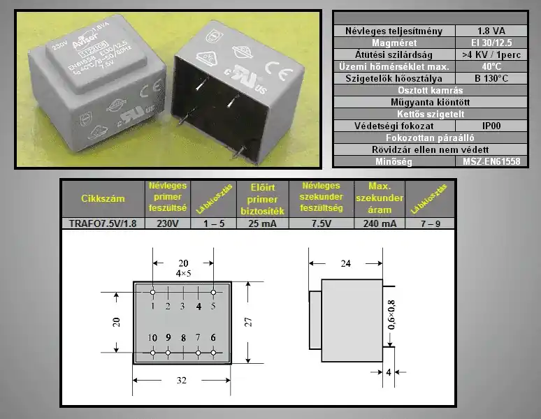 TRAFO 230VAC / 7.5VAC 240mA 1.8VA TRAFO7.5V/1.8Z/A Vedd meg most