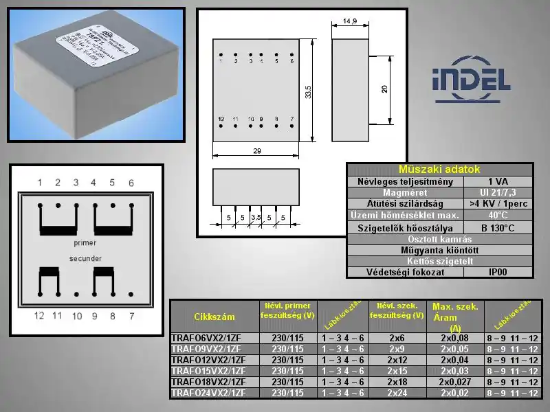TRAFO 2x115VAC / 2x9VAC 2×0.05A 1.0VA TRAFO9VX2/1ZF Kiárusítás
