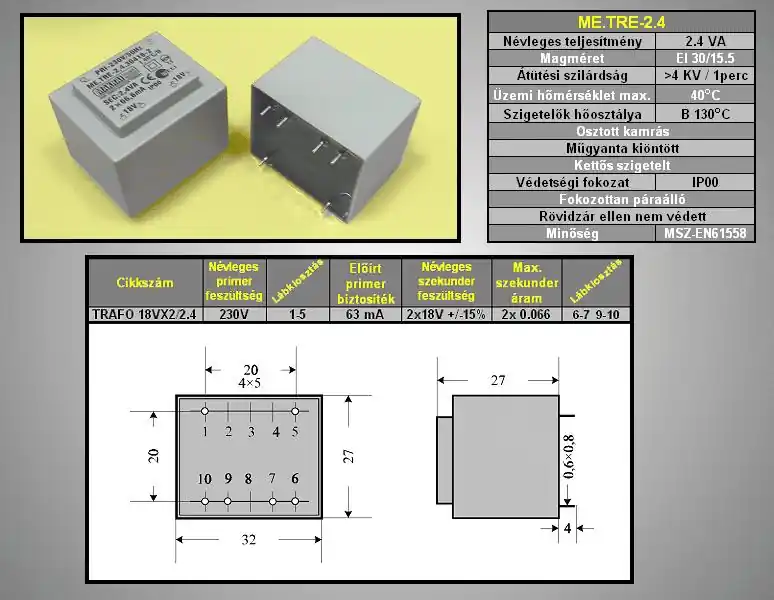 Utolsó esély TRAFO 230VAC / 2×18.0VAC 2.4VA TRAFO18VX2/2.4